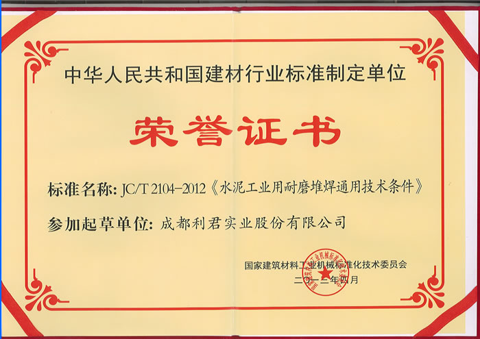 我公司榮獲“中華人民共和國建材行業(yè)標(biāo)準(zhǔn)制定單位榮譽(yù)證書”、常務(wù)副總經(jīng)理徐智平先生獲得“JCT2104-2012《水泥工業(yè)用耐磨堆焊通用技術(shù)條件》行業(yè)標(biāo)準(zhǔn)起草人榮譽(yù)證書”、項(xiàng)目經(jīng)理鄧四文先生被評為2012年度建材機(jī)械行業(yè)標(biāo)準(zhǔn)化先進(jìn)工作者。