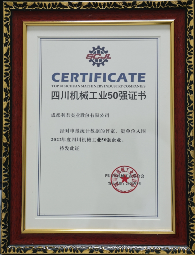 9月21日,四川省機(jī)械工業(yè)聯(lián)合會(huì)發(fā)布“2022年度四川機(jī)械工業(yè)50強(qiáng)企業(yè)”榜單,成都利君實(shí)業(yè)股份有限公司上榜。